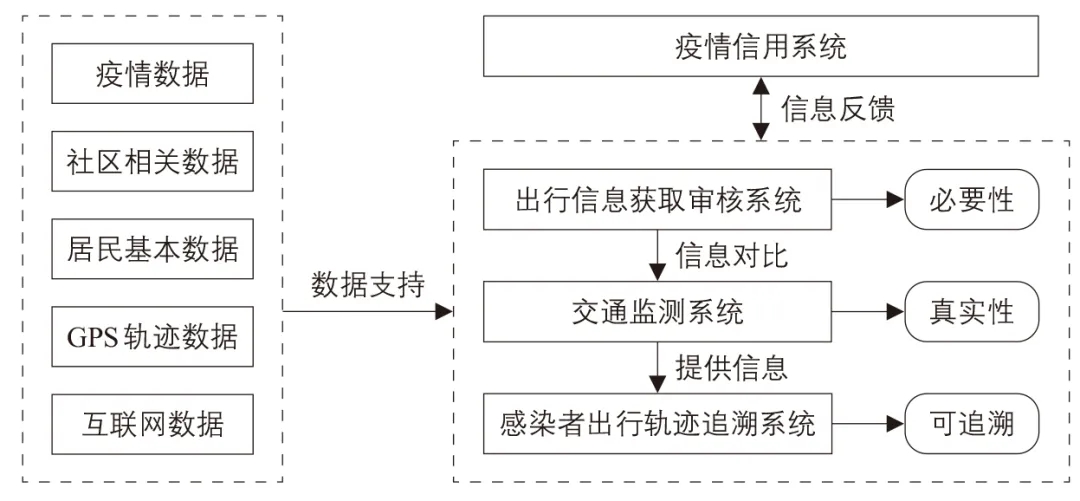隔離阻斷作為必要措施,可融合社區(qū)數(shù)據(jù)、居民基本數(shù)據(jù)、GPS軌跡數(shù)據(jù)等多源數(shù)據(jù),引入信用機制促進多系統(tǒng)共同合作,通過必要性審核限制出行頻次,通過信息交叉驗證確保出行信息真實性和可追溯性,從而提升城市交通韌性。所需城市交通防疫各子系統(tǒng)功能關系如下圖所示。