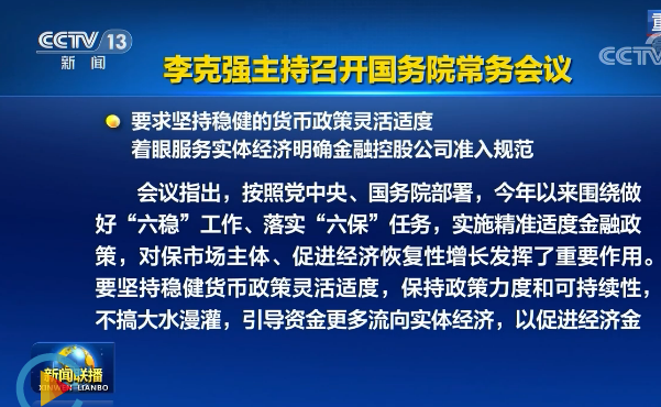 李克強(qiáng)主持召開(kāi)國(guó)務(wù)院常務(wù)會(huì)議 要求堅(jiān)持穩(wěn)健的貨幣政策靈活適度 著眼服務(wù)實(shí)體經(jīng)濟(jì)明確金融控股公司準(zhǔn)入規(guī)范等
